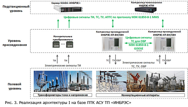 Важнейшим отличием данной архитектуры от описанных выше является обработка аналоговых сигналов телеизмерений с трансформаторов тока (ТТ) и напряжения (ТН) в формате цифрового потока МЭК 61850‑9‑2. Для преобразования электрических сигналов в цифровой вид применяются преобразователи аналоговых сигналов (ПАС) ИНБРЭС-ПП-А, устанавливаемые на полевом уровне вблизи ТТ и ТН. Таким образом в данной архитектуре и сигналы телеизмерений, и сигналы телесигнализации поступают в АСУ ТП и внешние подсистемы в цифровом виде. Аналогично, в цифровом виде, передаются и сигналы телеуправления.
