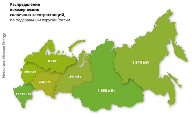 В исследовании говорится, что солнечные электростанции, установленные предприятиями, в данный момент распределены по федеральным округам неравномерно. Большая часть фотоэлектрических установок построена на Юге (11 377 кВт), в Сибири (1582,9 кВт) и на Дальнем Востоке (1240 кВт). При этом благоприятные условия для строительства СЭС есть и в Центральном федеральном округе, на Урале и Поволжье. Связано это с достаточно высоким количеством солнечной радиации, в особенности на юге каждого из перечисленных федеральных округов.