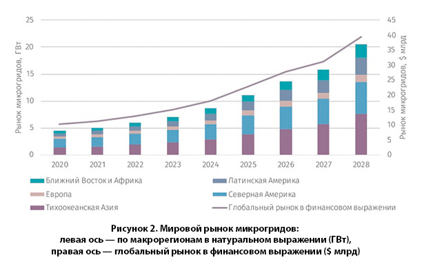 По оценке EnergyNet, объем мирового рынка микрогридов к 2028 достигнет 22 млрд долларов, прирост годовой мощности по микрогридам будет достигать 11 ГВт вводов в год (Рисунок 2).