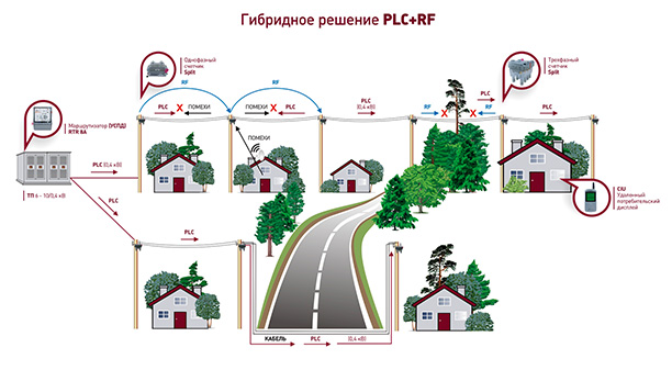 Сильное экранирование сигнала из-за зданий или неровной местности в начале линии и локальный шум по одной фазе в середине линии приводят к отсутствию связи на всем участке как отдельно для RF, так и отдельно для PLC. А PLC+RF Гибрид продолжает надежно работать. Таким образом, инновационное гибридное решение работает лучше, чем два независимых канала передачи данных.