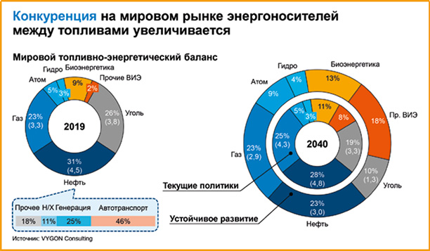 Управляющий директор VYGON Consulting Григорий Выгон в качестве внешних назвал такие тенденции, как увеличение предложения сланцевой нефти на 46% к 2030 г; снижение темпов роста спроса на нефть до 0,3% к 2040 г.; изменения рынков сбыта за счет роста доли АТР в потреблении на 5–7% к 2040 г.; развитие цифровых технологий спроса и предложения — на 2,4 трлн бнэ запасов к 205 г.; дискриминационные меры, а именно, санкции, трансграничный углеродный налог.