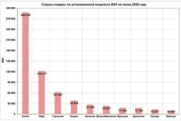 По суммарной установленной мощности на конец 2020 года пятерка крупнейших рынков не изменилась: Китай, США, Германия, Индия и Испания. На эти государства в совокупности приходится 73% всех ветроэнергетических мощностей в мире. Всего в мире установлено почти 773,0 тыс. МВт (95,5% из них на суше). В Китае показатель достиг 278,0 тыс. МВт, в США — 122 тыс. МВт.