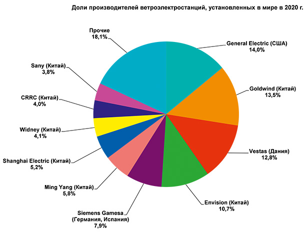 По данным компании BloombergNEF, в десятке лидеров по производству ветроэлектростанций (суммарно наземных и прибрежных) только три производителя не из Китая: на первом месте американский концерн General Electric (14% из общемирового ввода мощностей), на третьей позиции датская компания Vestas (12,8%), а на пятом месте — германо-испанский производитель Siemens Gamesa с долей 7,9%. Семь китайских компаний обеспечили ввод 47,2% всей мощности. На долю всех производителей мира, не вошедших в десятку лидеров, пришлось 18,1%.