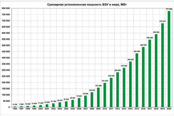 Прошлый год стал рекордным для мировой ветроэнергетической отрасли. Несмотря на пандемию коронавируса, объем ввода мощностей достиг 93,0 тыс. МВт, что почти на 30 тыс. МВт превысило показатель предыдущего рекорда (в 2015 году было введено немногим более 63,0 тыс. МВт). Рост к 2019 году составил 53%. При этом 86,9 тыс. МВт было построено на суше (93,5% от введенной мощности) и 6,1 тыс. МВт — в прибрежных водах.