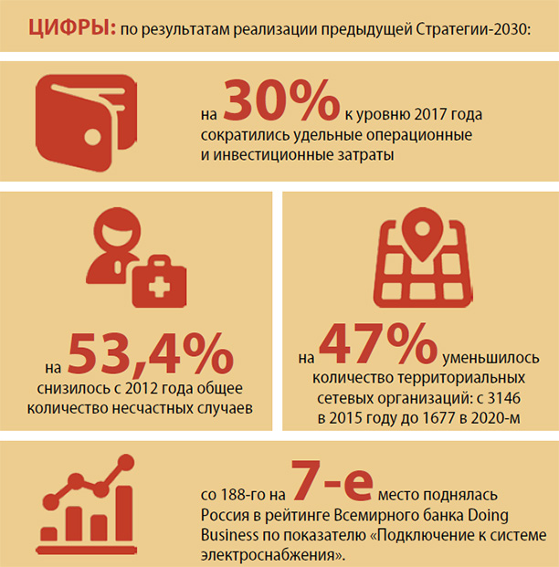 Давайте посмотрим, что удалось достигнуть по результатам реализации предыдущей Стратегии-2030. Мы смогли сократить удельные операционные и инвестиционные затраты к уровню 2017 года на 30% и снизить общее количество несчастных случаев с 2012 года на 53,4%. Количество территориальных сетевых организаций уменьшилось на 47% — с 3146 в 2015 году до 1677 в 2020-м. Обеспечено строительство инфраструктуры для реализации важных государственных проектов, включая энергомост в Крым. Кроме того, Россия поднялась со 188-го на 7-е место в рейтинге Всемирного банка Doing Business по показателю «Подключение к системе электроснабжения».