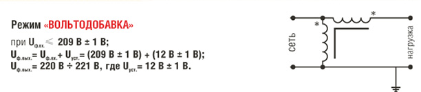 а) режим «вольтодобавка» соответствует уровню входного напряжения Uвх = 208 В и ниже, вплоть до 170 В, т.е. до нижнего предела рабочего диапазона. При этом Uвых = Uвх + 12В;