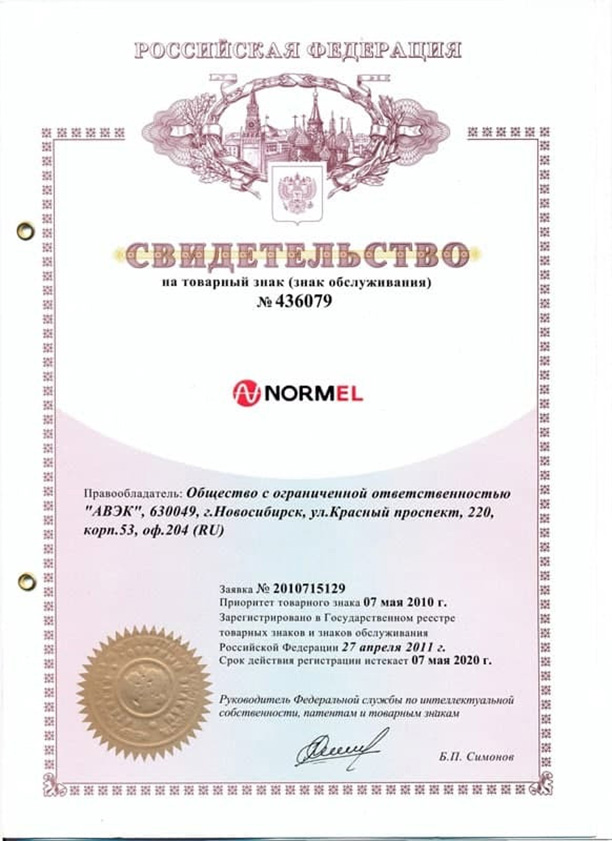 Товарный знак «NORMEL» защищен свидетельством на товарный знак № 436079. Право выпуска подтверждено лицензионным соглашением (приложение к патенту № 2377630) и оформлено в виде приложения.