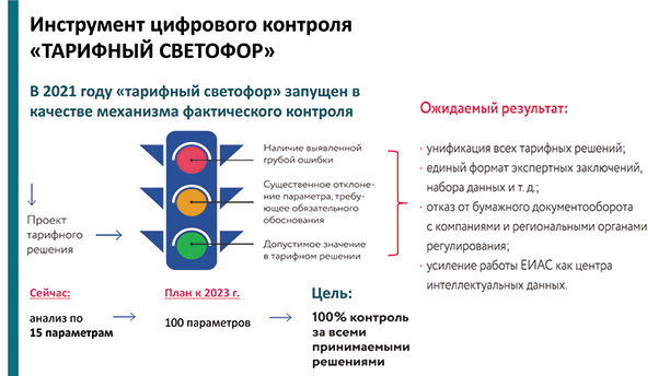 «Вместе с тем, мы делаем ставку на так называемый «Тарифный светофор» — инструмент цифрового контроля, актуальный для региональных энергетических комиссий, регуляторов и компаний. По сути, это автоматический контроллер, который будет по большому количеству параметров выискивать нарушения при формировании тарифов регуляторами. Следить за обоснованностью тарифных решений, автоматически анализировать и верифицировать их на предмет соответствия действующему законодательству.