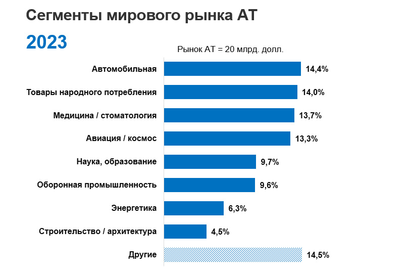Надо отметить, что за последние годы мы видим перераспределение доли аддитивных технологий по секторам промышленности на мировом рынке. Если в 2021 году лидировали авиация и космос, то в 2022 году на первое место стала выходить автомобильная промышленность, и 2023 год подтвердил эту тенденцию. За автомобильной промышленностью теперь идут товары народного потребления и медицина. А авиация и космос сместились на четвертое место.
