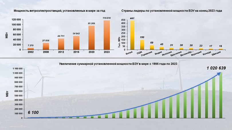 В 2023 году в мире ввод в эксплуатацию ветроэнергетических установок (ВЭУ) составил 116 616 МВт, что на 50% больше, чем годом ранее. Объем ввода достиг рекордного значения и впервые превысил (причем с солидным запасом) символическую отметку 100 тыс. МВт.