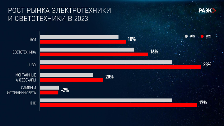В прошлом году российский рынок электротехники и светотехники практически по всем направлениям показал активный рост. Ожидается, что в этом году он также будет увеличиваться. При этом поставки по параллельному импорту значительно сократились, их заменила продукция отечественных предприятий. К такому выводу пришли в Российской ассоциации электротехнических компаний (РАЭК) по итогам исследования рынка электротехники в 2023 году.