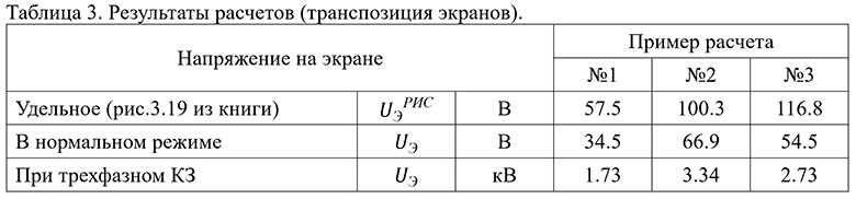 Для КЛ 10, 35, 110 кВ результаты расчетов UЭ в нормальном режиме и при КЗ даны в табл.3 и с запасом не превышают допустимых значений (100 В и 5 кВ). Поэтому для трех указанных КЛ достаточно выполнить один полный цикл транспозиции экранов (рис. 3).
