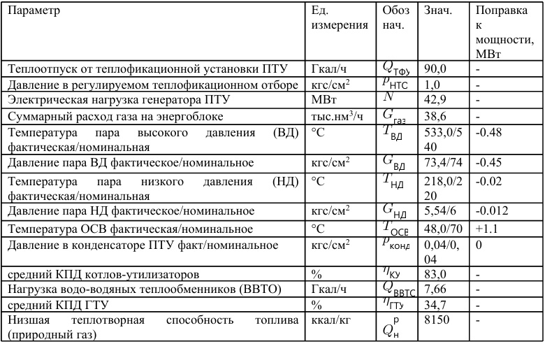 Таким образом, используя формулы 2-3, вышеуказанные значения УРТБэ/э и параметры режима работы, приведенные в таблице 1, получим следующее: расход газа на ПГУ энергоблоке, определенный по данным НТХ, будет равен 35,55 тыс. нм