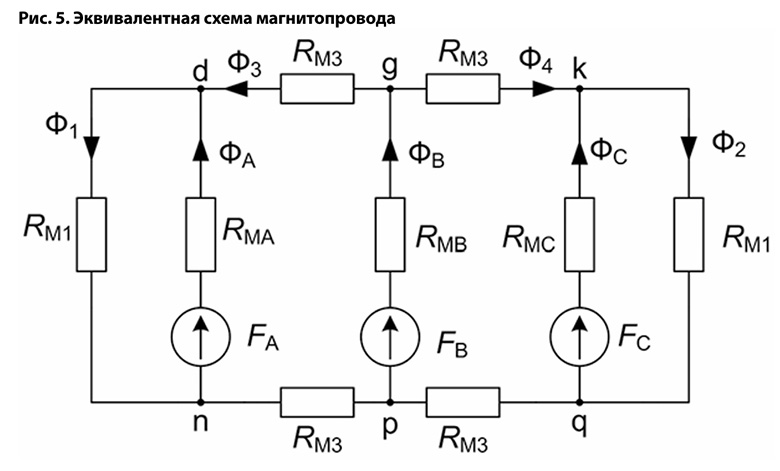 i — магнитные потоки. Эквивалентная электрическая схема магнитопровода приведена на рис. 5.