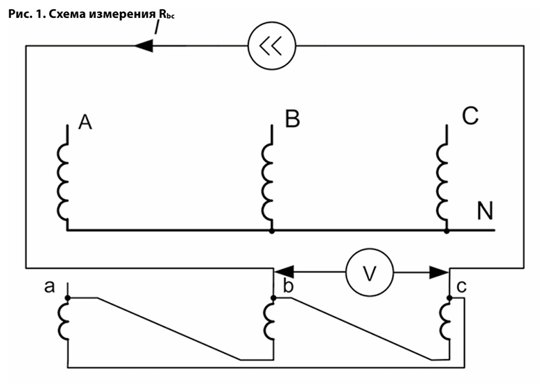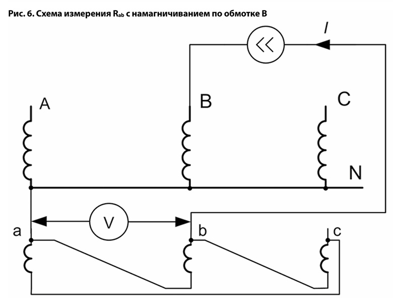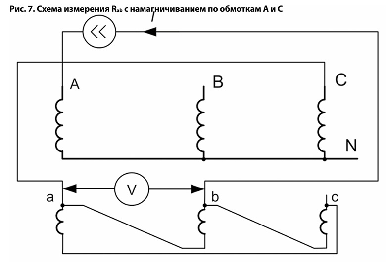 В литературе предлагается при измерении сопротивления обмотки НН включать последовательно обмотки ВН и НН одной фазы. Пусть измерение сопротивления обмотки ab производится по схеме на рис. 6.