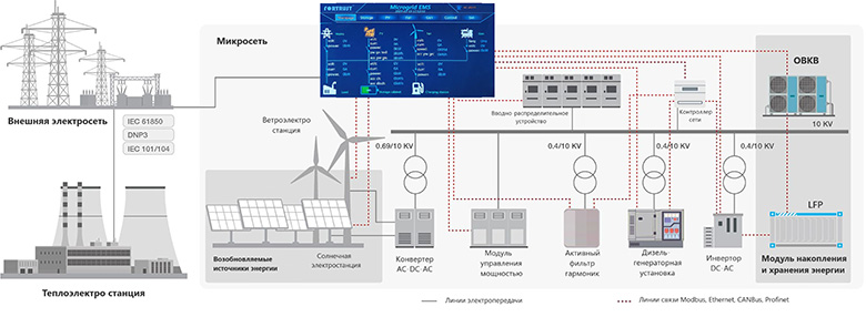 СУЭ обеспечивает автономное управление, защиту и мониторинг как в параллельном режиме с внешней электросетью, так и в автономном. С ее помощью можно оптимизировать нагрузку, потребление реактивной мощности, снизить влияние гармонических искажений на электрооборудование. Система управления интегрируется с ВИЭ (ВЭС, СЭС), системами накопления и хранения, помогает управлять и планировать энергопотребление.