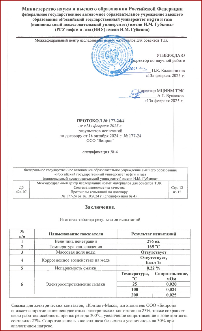 Смазка «Контакт-Макс» подвергалась испытаниям по ГОСТ 17441–82 «Соединения контактные электрические. Приемка и методы испытаний» и получила положительную оценку от экспертов Российского государственного университета нефти и газа (национального исследовательского университета) имени И.М. Губкина (г. Москва) и специализированной Испытательной лаборатории «СИГМА» (г. Уфа).