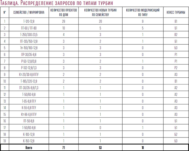 На УТЗ с определенного момента в качестве основного подхода к типизации турбин применяется разделение на классы. Классы определяются конструктивными особенностями турбин. Так, например все трехцилиндровые турбины с двухпоточным ЦНД относятся к классу В.1, в том числе семейство турбин Т-100-12,8. Распределение запросов по проектам реконструкций и модернизаций по классам приведено на рисунке 2.