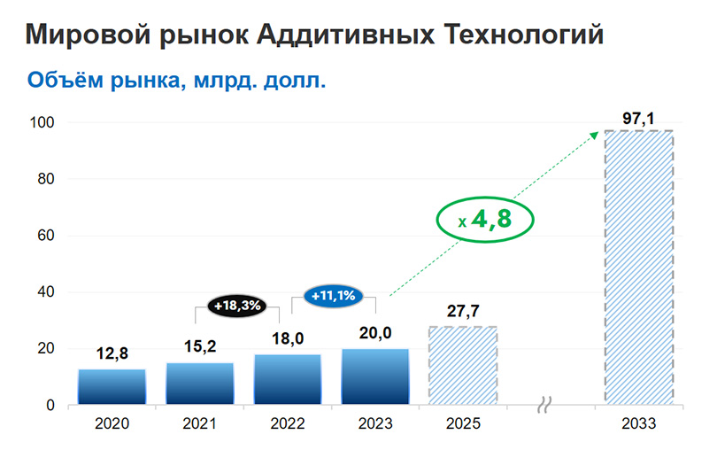 — Как ожидается, мировой рынок аддитивных технологий к 2033 году будет составлять 97,1 миллиарда долларов, и этот прогноз подтверждается с каждым годом.